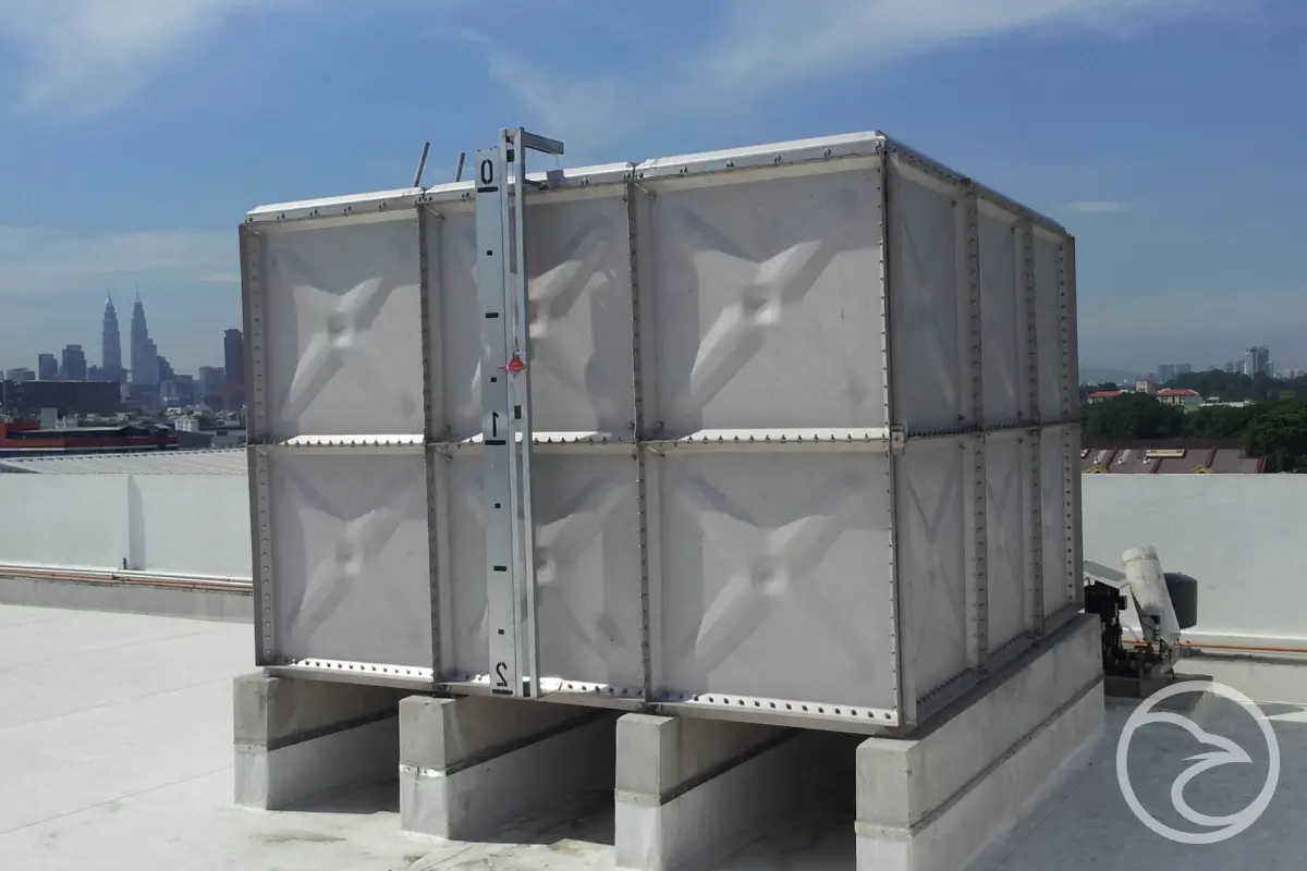 Stainless steel water tank installation at commercial site